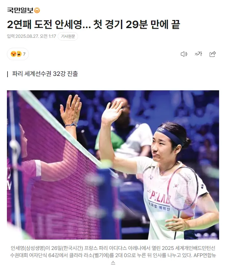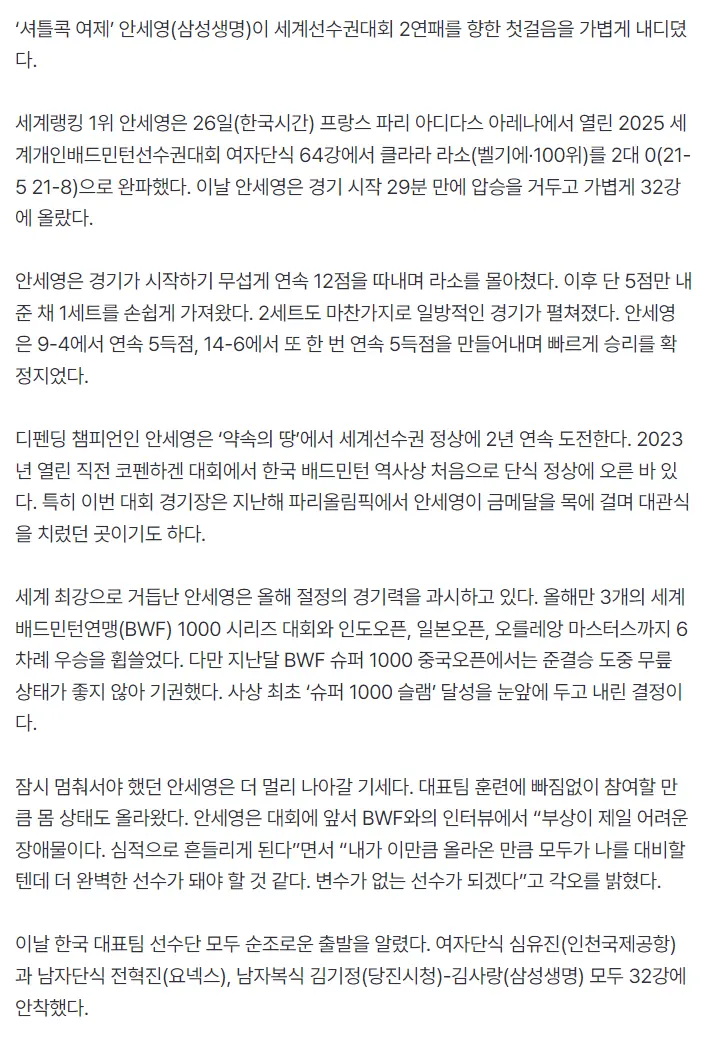 文中写道:世锦赛女单卫冕冠军在“福地”连续两届挑战世锦赛冠军。2023年在哥本哈根世锦赛上安西街完成了韩国羽毛球史上首个世锦赛单打冠军,2025年世锦赛又是在去年巴黎奥运会安洗莹获得女单冠军的地方举行。